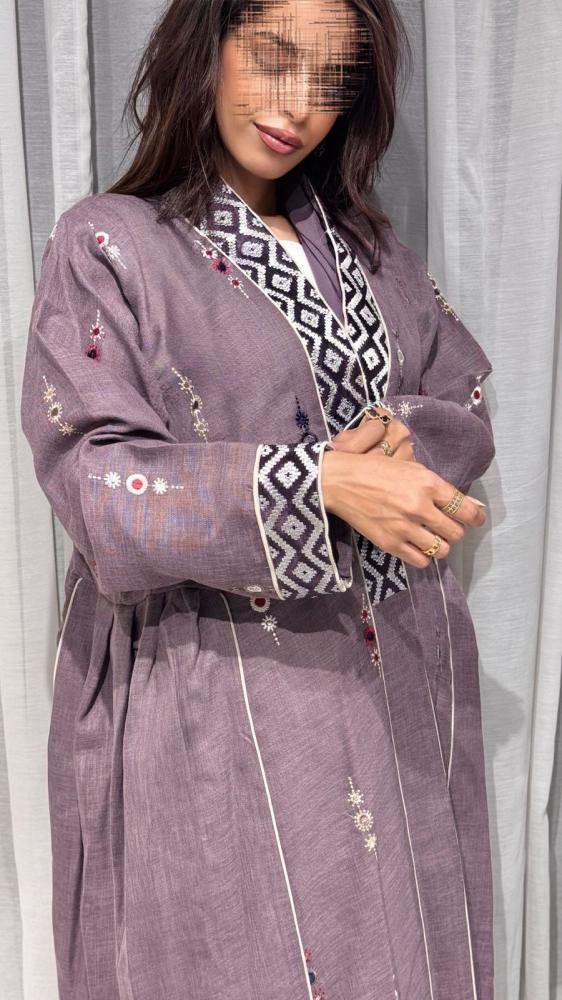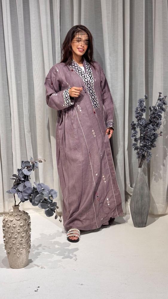 عباية لنن مطرز لون لحمي القصه ربع كلوش.