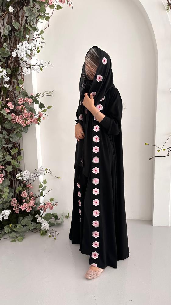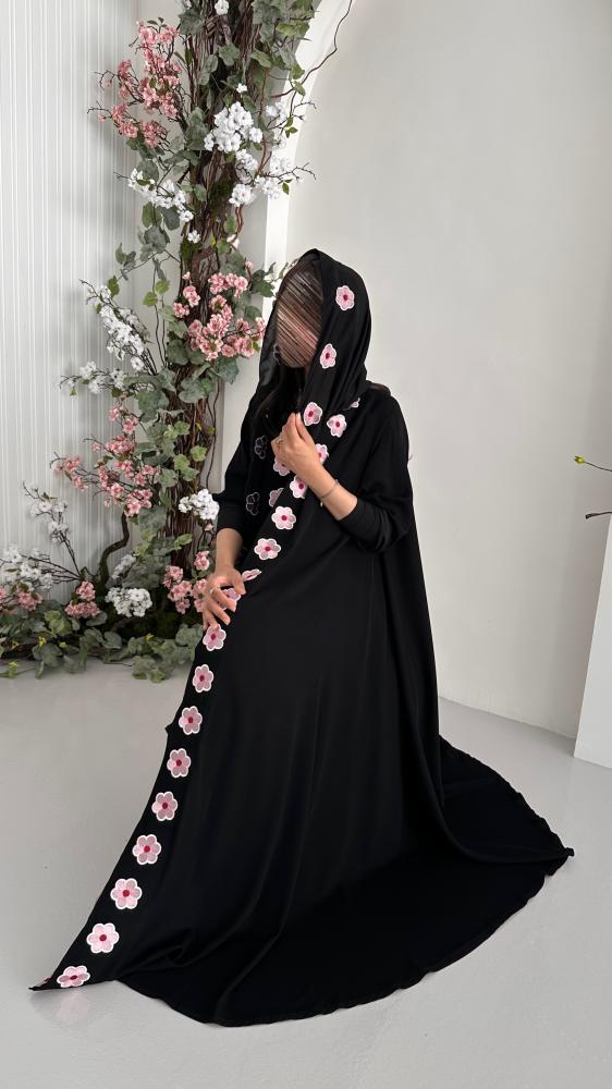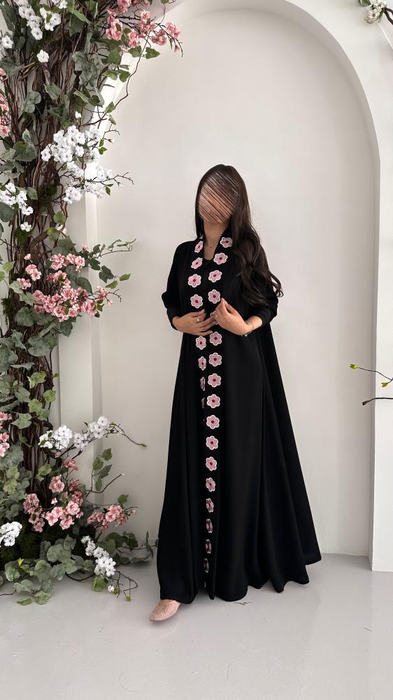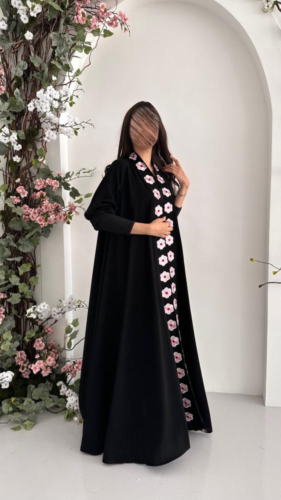 يبرز جمال العباءة بتطريز ورد وردي من الأمام، ليضفي فخامة ناعمة وتفاصيل تلفت الأنظار.