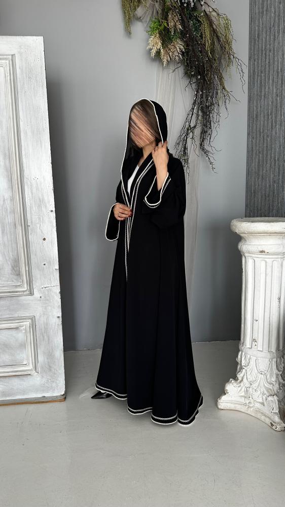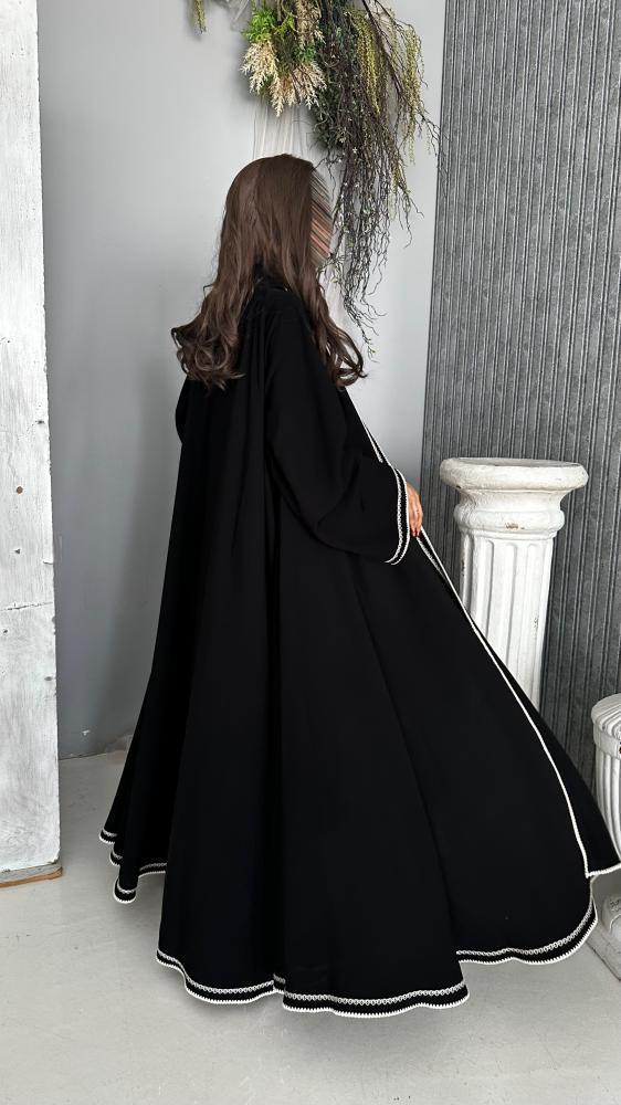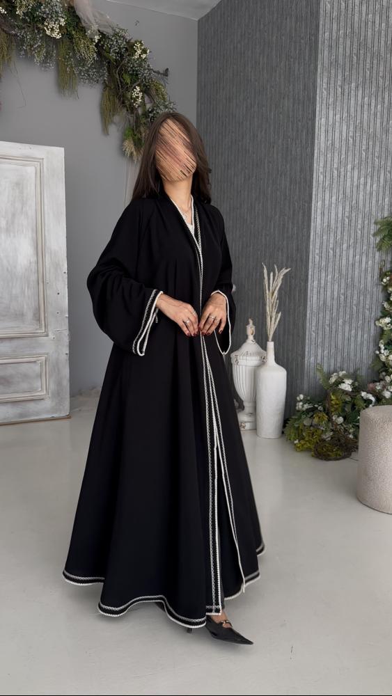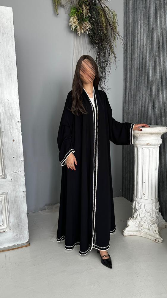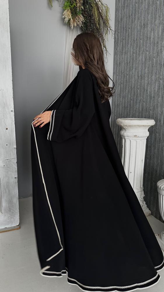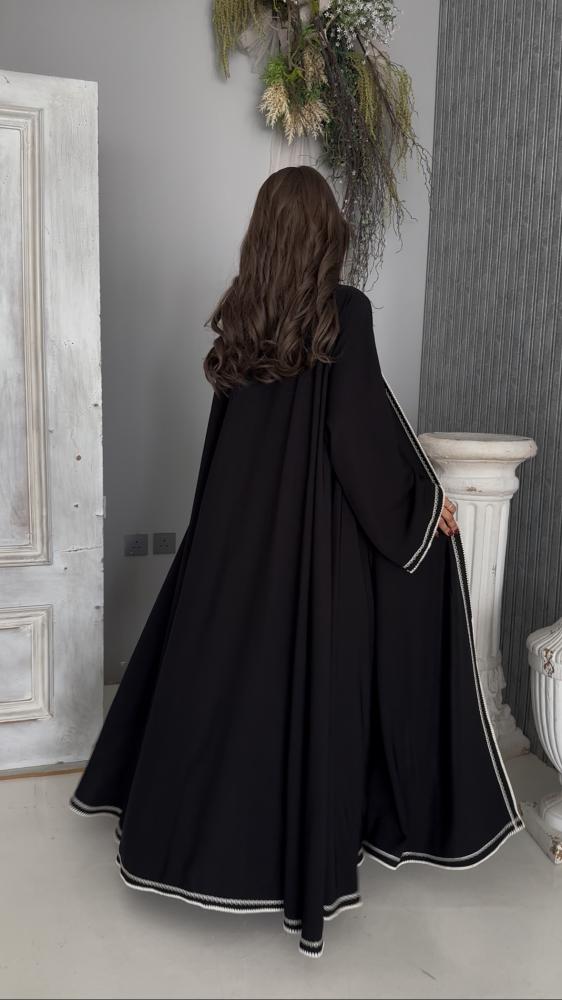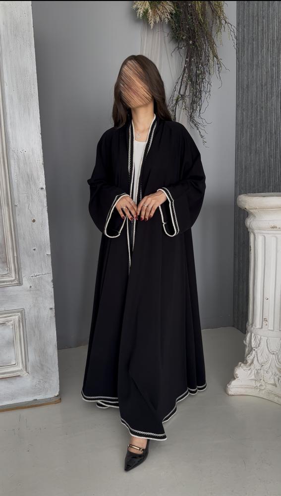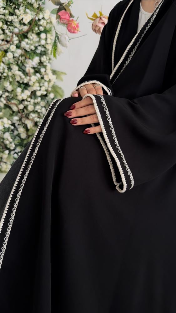 يبرز جمال العباءة بتحديد أبيض ولمسات لولو على الأطراف، لتضفي لمسة راقية ومميزة لكل تفصيلة.