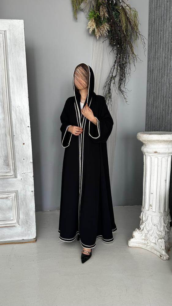 عباية دبل كلوش ياقه كلفه سناره ابيض قماش انترنت.
